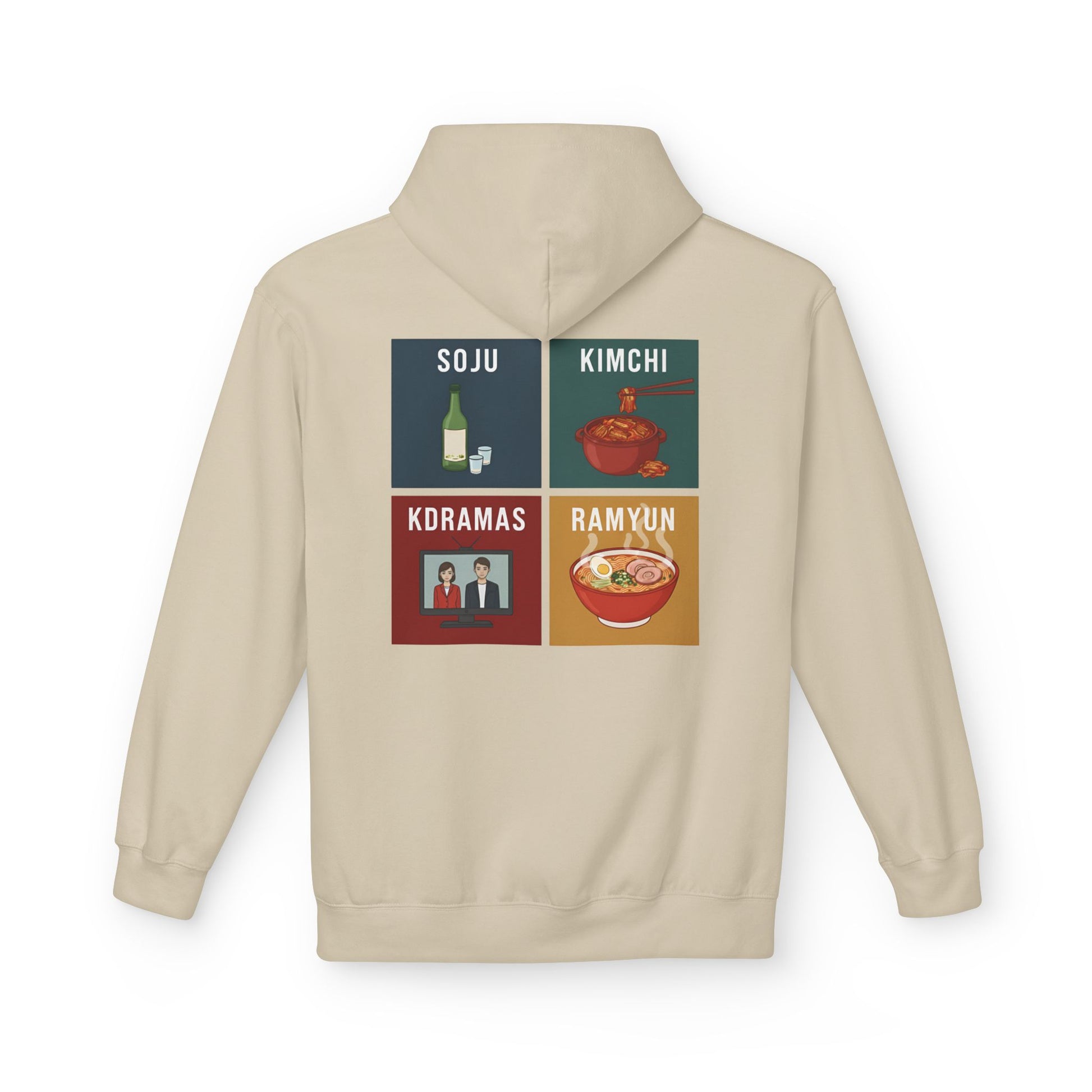 From K-dramas to ramyun, this four-panel hoodie celebrates the flavors and traditions that bring comfort and balance to everyday chaos.